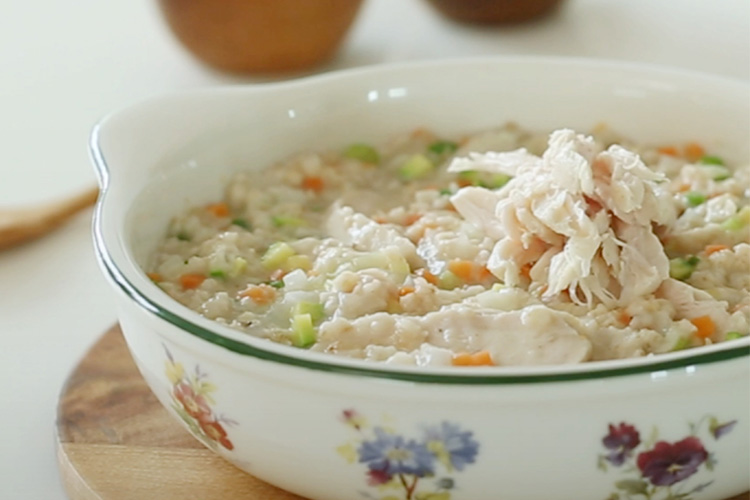 닭가슴살을 잘게 찢어 절반을 오트밀에 올려주세요